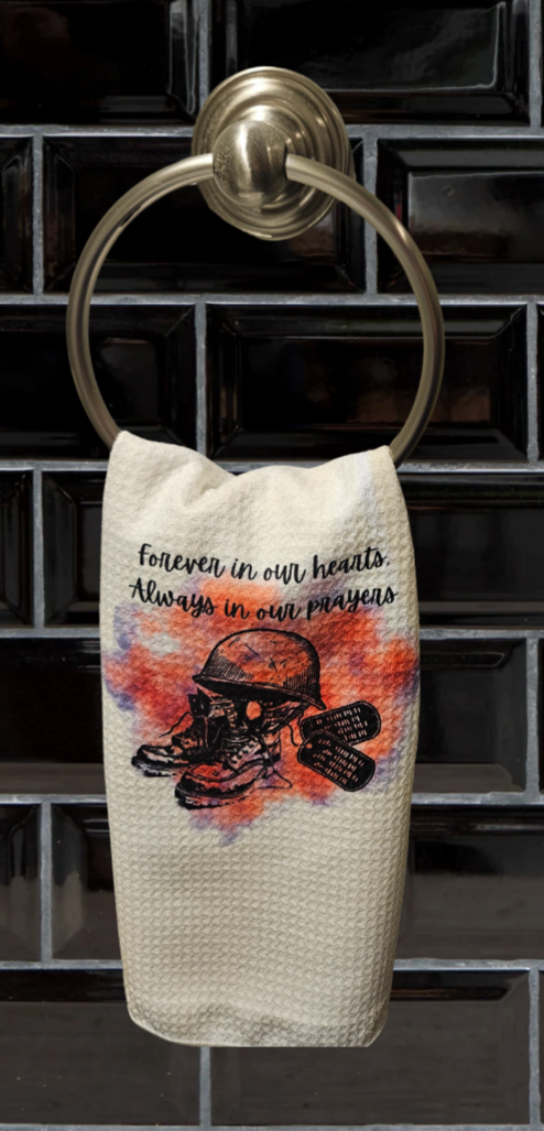 This beautifully designed microfiber towel features a touching tribute to our heroes with a solemn arrangement of combat boots, a military hat, and dog tags engraved with the heartfelt messages "Forever in Our Hearts" and "Always in Our Prayers." Crafted for softness and durability, this towel serves as a gentle reminder of the courage, sacrifice, and legacy of those who served. Perfect for display, everyday use, or as a meaningful gift for military families and veterans.