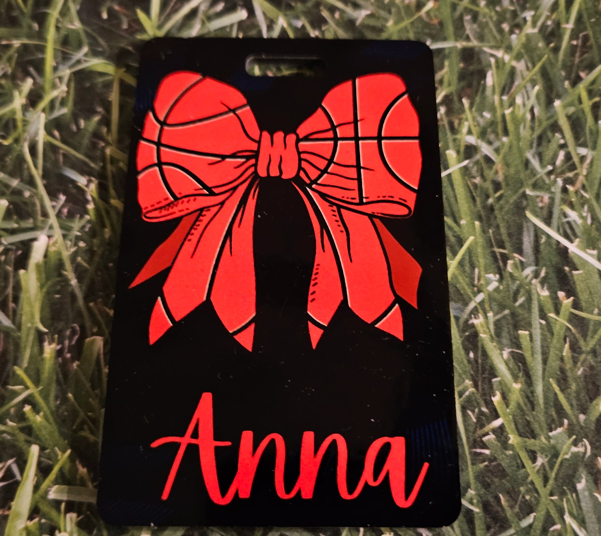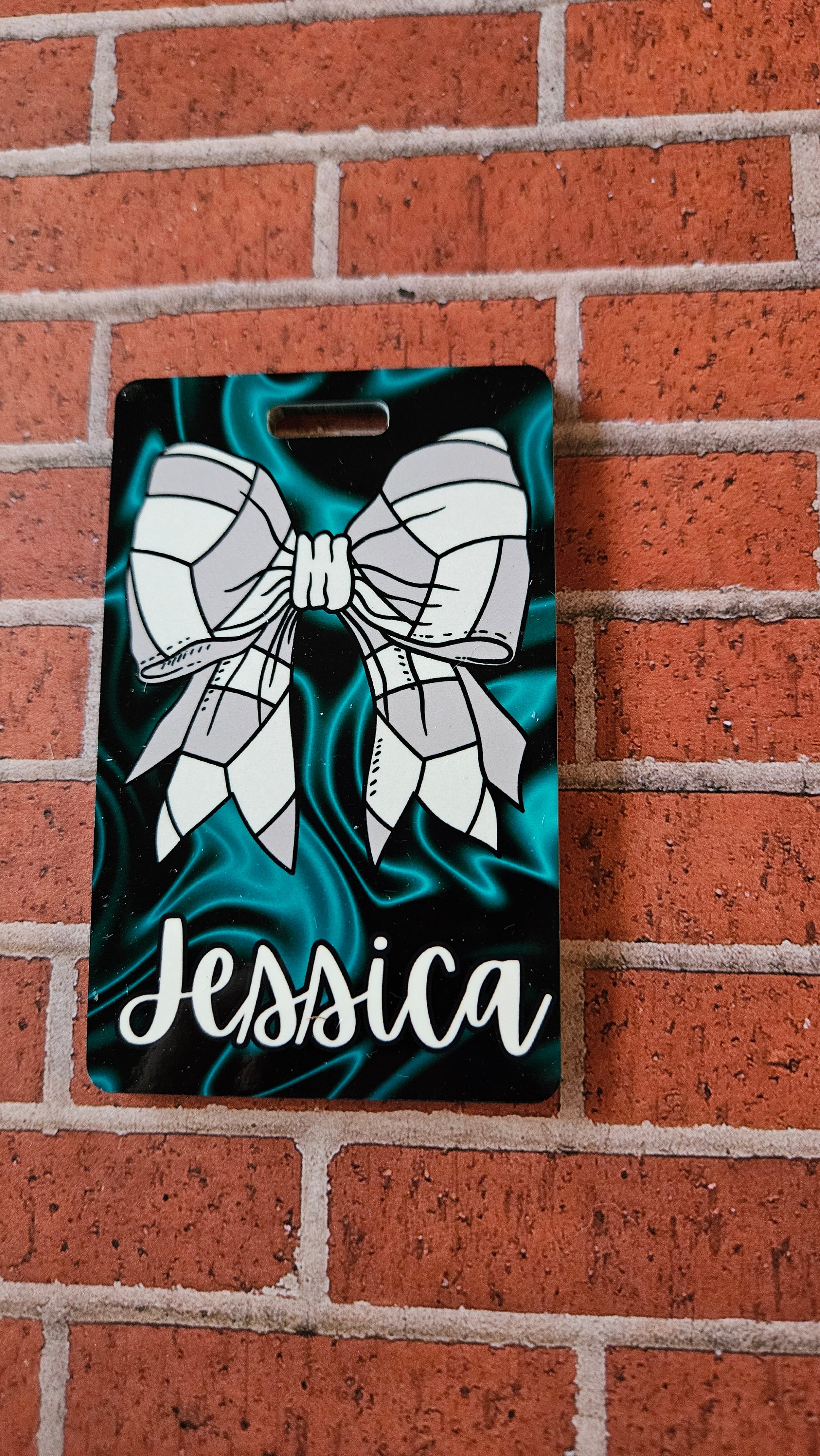 Label your sports bag with your sports bows, team colors, and name on the double-sided tag. All tags come with a clear loop to attach to the bag. In the section below type the name exactly how you want it to be spelled. Also list the sport and team color or color you want the background to be.